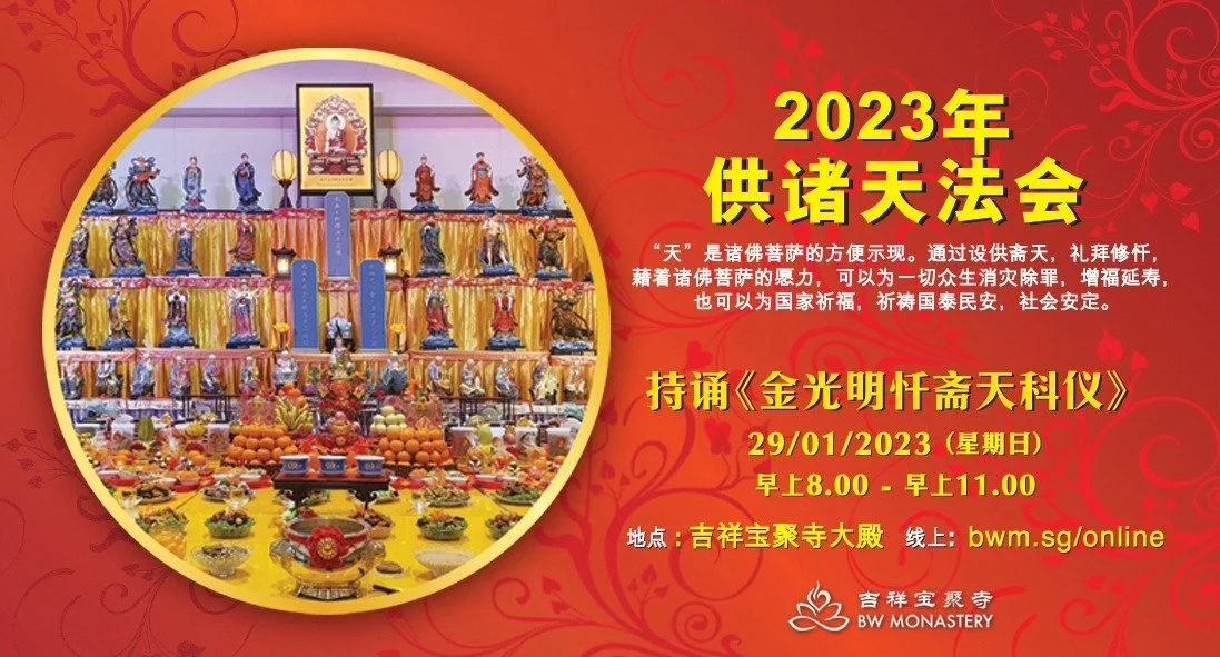 The heaven realm is where the Buddhas and Bodhisattvas manifest too. Through offering to the heavens, paying reverence and with repentance, through the Buddhas and Bodhisattvas’ strength of aspiration, we will be able to benefit all sentient beings to be free from all sufferings and all eliminate obstacles, for bliss and longevity to be obtained, and supplicate for the country to have prosperity, peace, and social stability for its citizens.