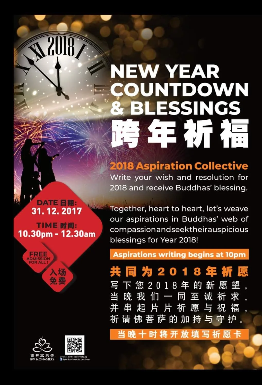 Back to All Events BW Monastery New Year Countdown & Blessings Sunday 31 December 2017 23:00 Monday 1 January 2018 00:30 BW Monastery Shrine Hall 1 Woodlands Drive 16 Singapore Singapore (map) Google Calendar ICS Write your wish for resolution for 2018 and receive Buddha's blessing. Together heart to heart let's weave our aspirations in Buddha's web of compassion and seek their auspicious blessings for year 2018 Powered by Eventbrite