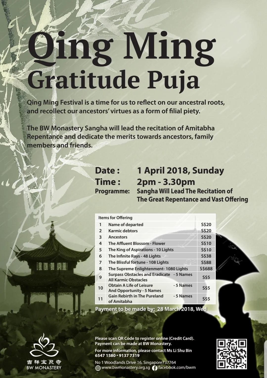 The BW Monastery Sangha will lead the recitation of Amitabha Repentance and dedicate the merits towards ancestors, family members and friends.