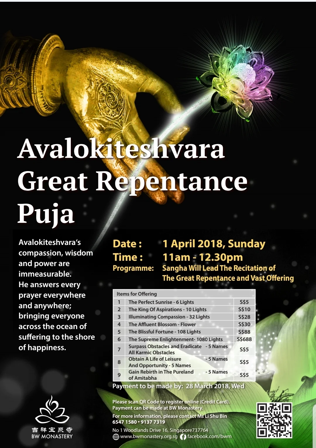 Avalokiteshvara‘s compassion, wisdom and power are immeasurable. He answers every prayer everywhere and anywhere; bringing everyone across the ocean of suffering to the shore of happiness.
