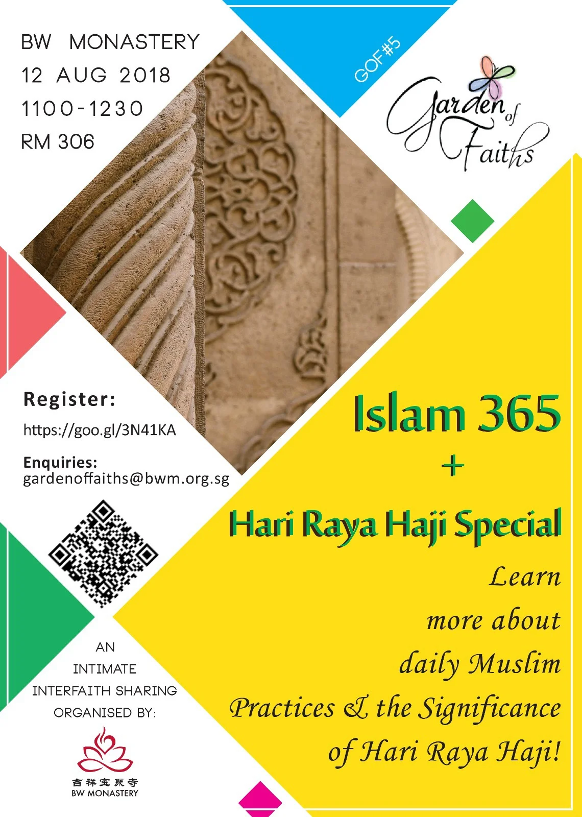 [Islam 365 + Hari Rara Haji Special] By Garden of Faiths Date: 12 August 2018, Sunday Time: 11.00am - 1230pm Venue: BW Monastery, Room 306