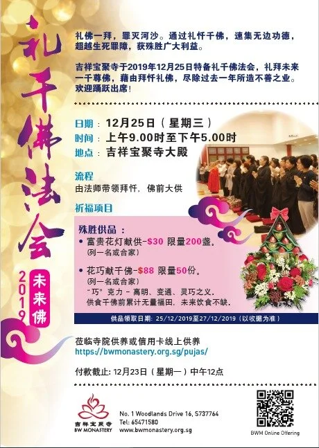 BW Monastery is specially arranging for the 1000 Buddhas Repentance Puja to be held on 25 December 2019, to provide everyone the opportunity to prostrate to the 1000 Buddhas of the future . Through the repentance Puja, one can eliminate all the non-virtuous karma accumulated in the past year. All are welcome to attend!