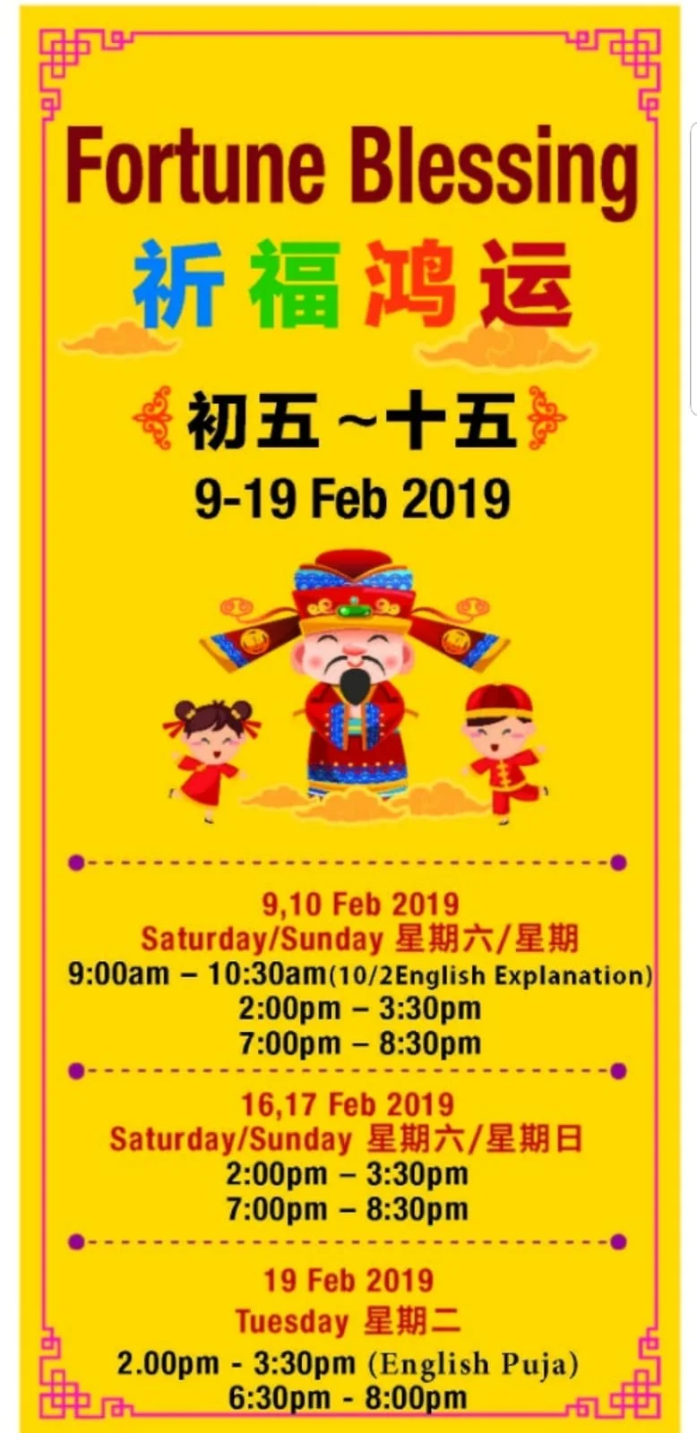 BW Monastery will be holding Fortune Blessing Grand Puja from 9th -19th Feb 2019. Lead by the Sangha Venerables, devotees can make mass offerings to the Three Jewels and give food to the spirits and deities. May one obtain abundant merits and wisdom, good health and clear his/her obstacles!