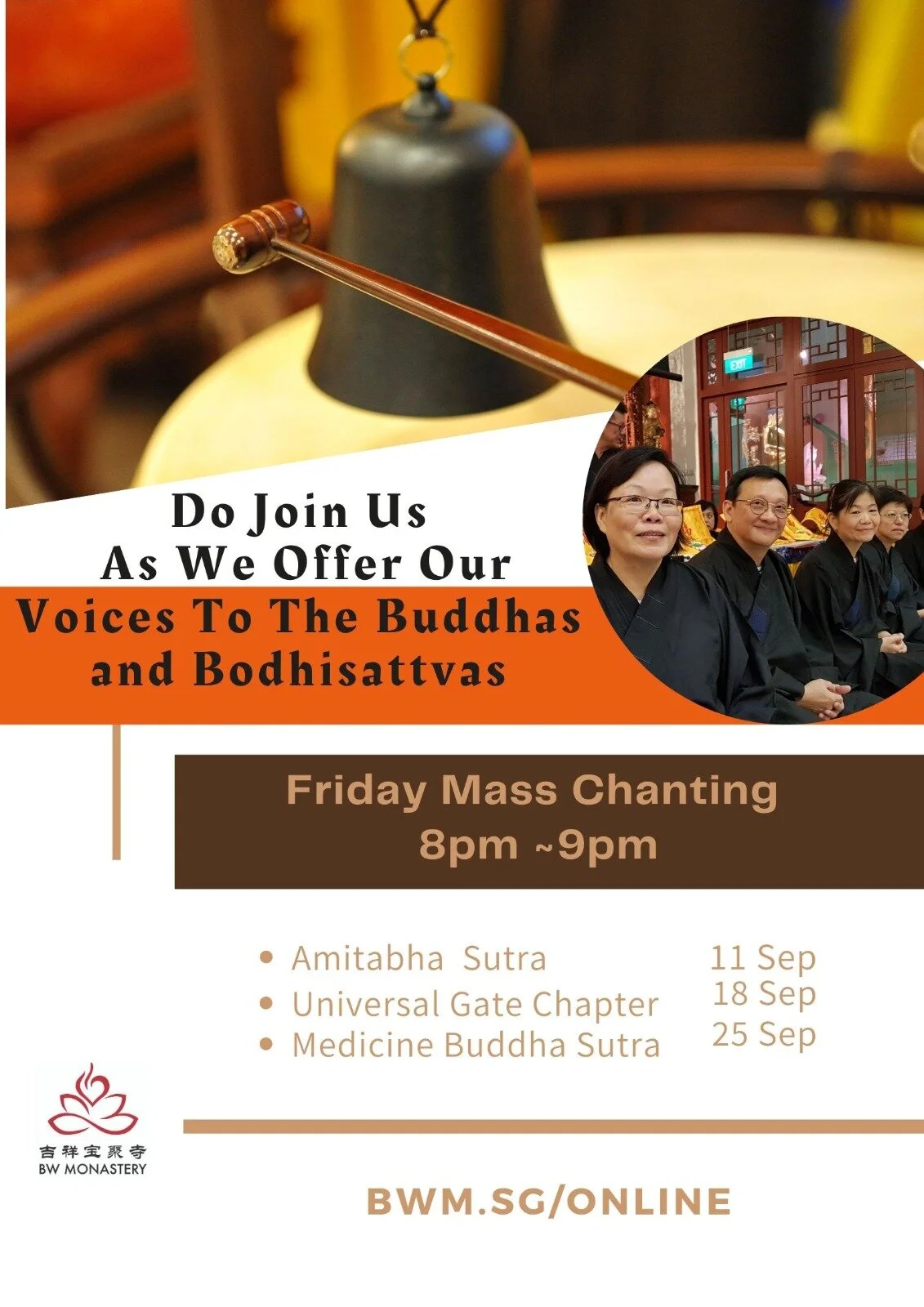BW Monastery’s Friday Mass Chanting will be back again this September. Due to the current circumstances, the mass chanting will be conducted online. For those who loves chanting and recitation, do join us as we offer our voices to the Buddhas and Bodhisattvas.