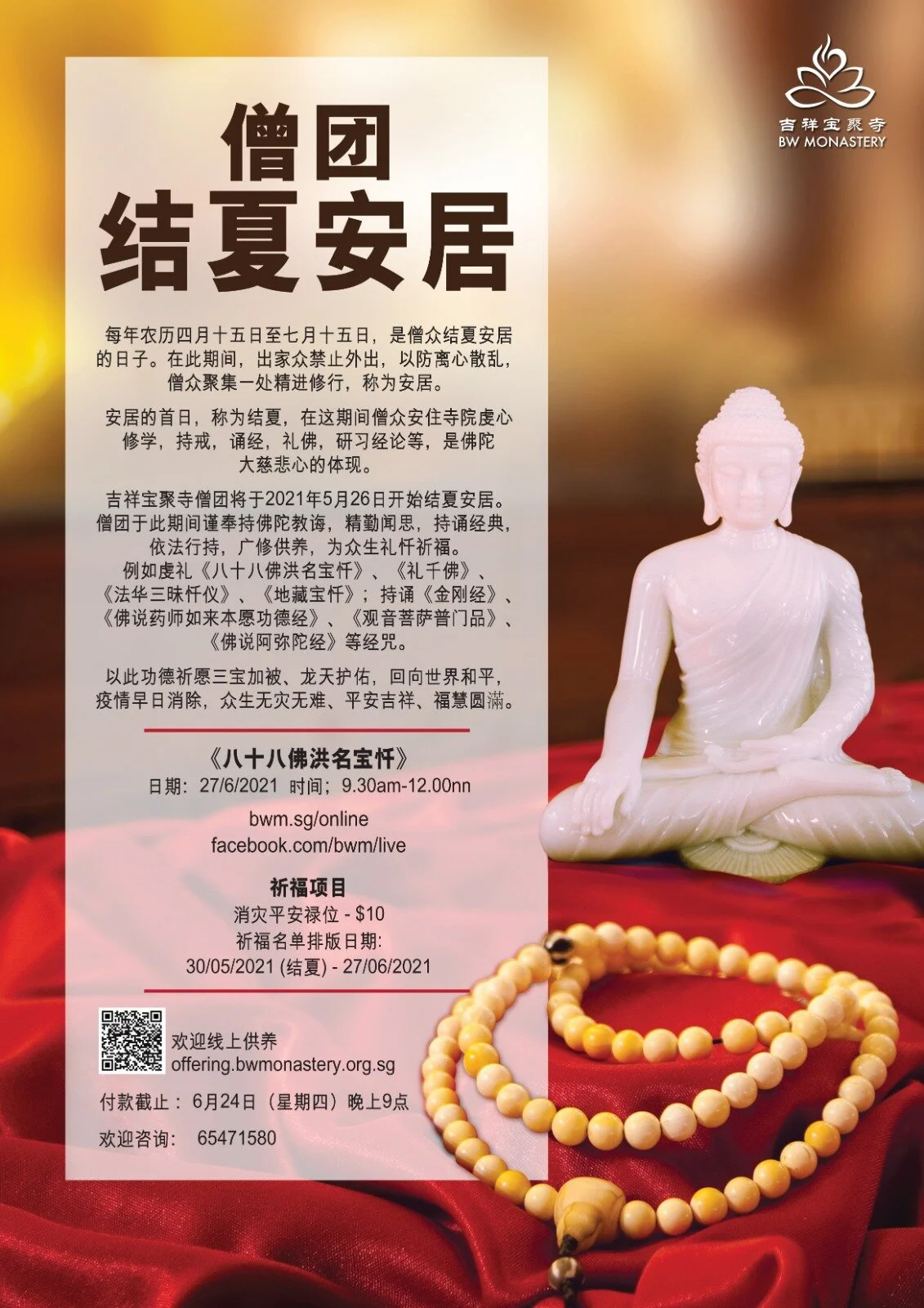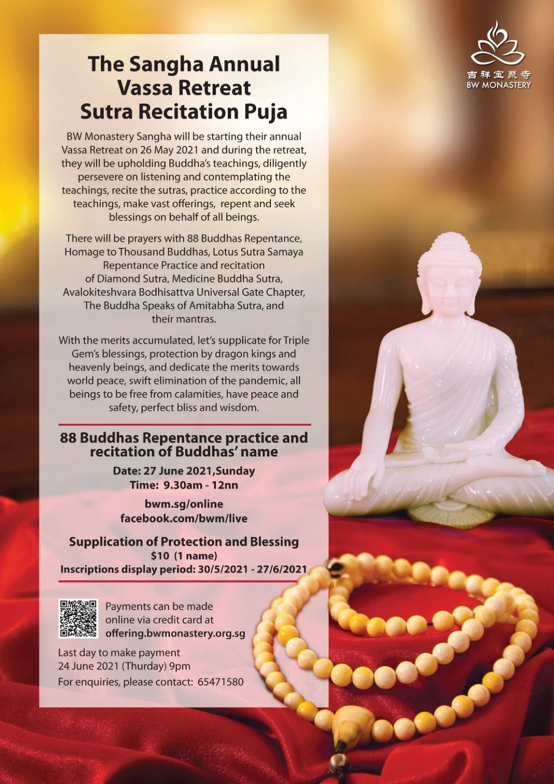 BW Monastery Sangha will be starting their annual Vassa Retreat on 26 May 2021 and during the retreat, they will be upholding Buddha’s teachings, diligently persevere on listening and contemplating the teachings, recite the sutras, practice according to the teachings, make vast offerings, repent and seek blessings on behalf of all beings.
