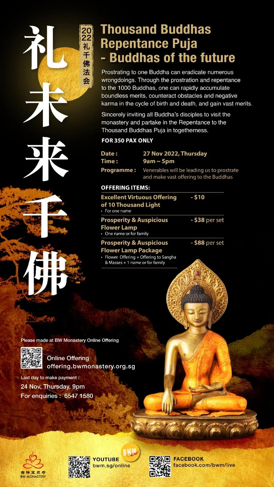 Come join us on 27 November 2022 , using our hearts and minds to recite all Buddhas’ name. For each prostration, sincerely repent, seek for bestowment of Buddhas’ compassion upon us, for all of our negative karmic deeds committed since limitless eons to be eliminated. At the same time, accumulate immeasurable bliss, virtues and wisdom! May we dedicate the merits from paying homage to the thousand Buddhas to be dedicated for the pandemic to be eliminated swiftly, for the country and citizens to have peace and safety, all beings to be free from suffering and attain happiness.