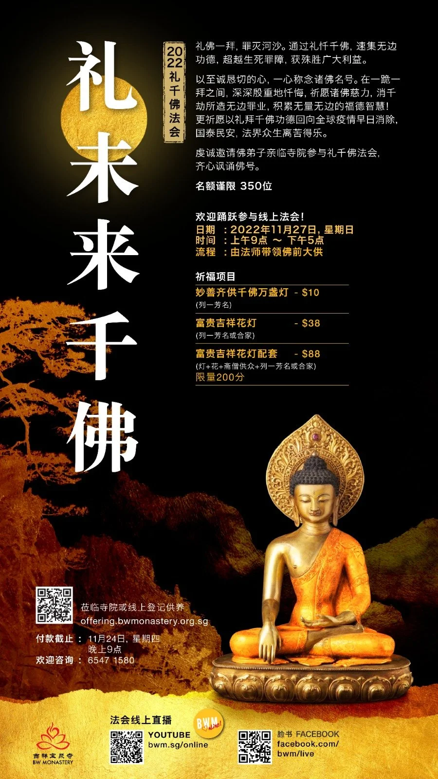 虔诚邀请佛弟子亲临寺院参与礼千佛法会,齐心拜忏,讽诵佛号。名额谨限 350位 👉 请按此链接报名礼千佛法会 。也欢迎参与线上法会!