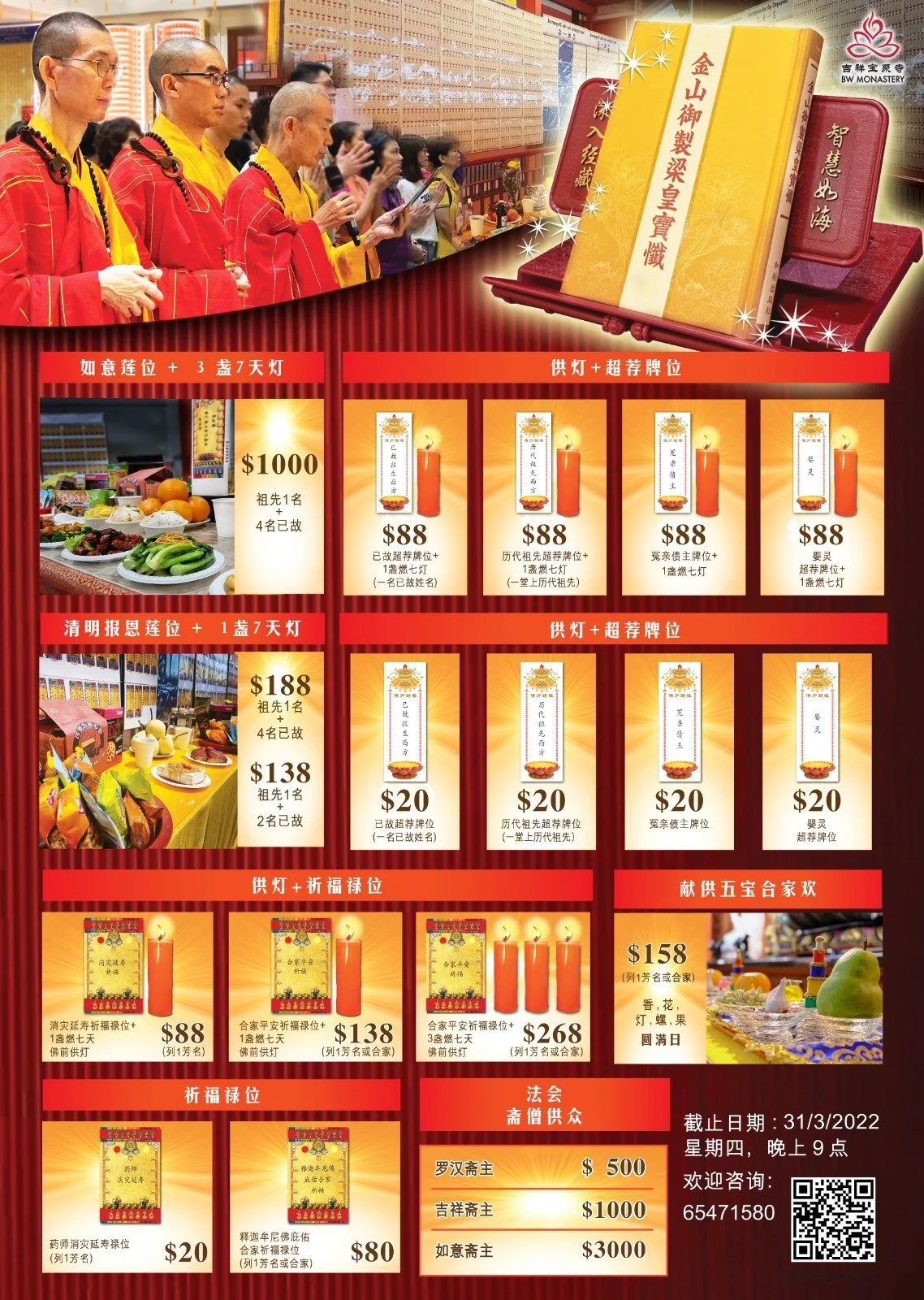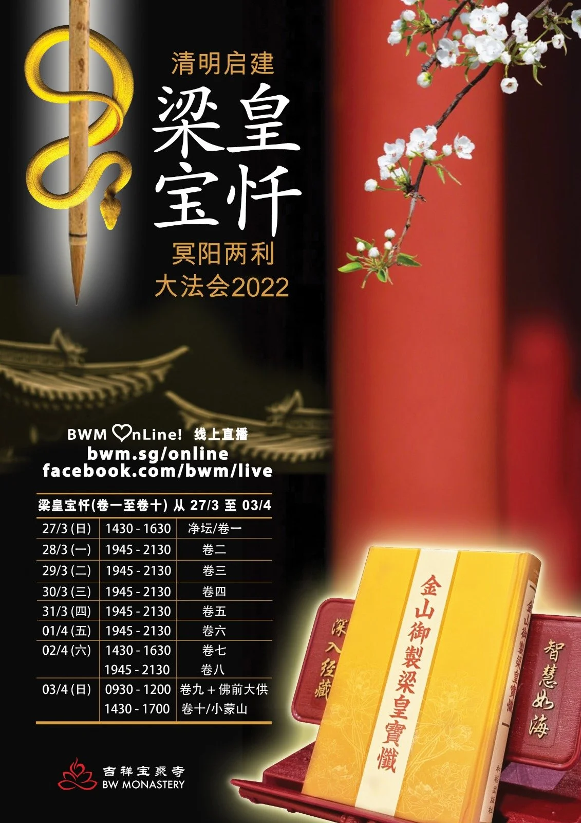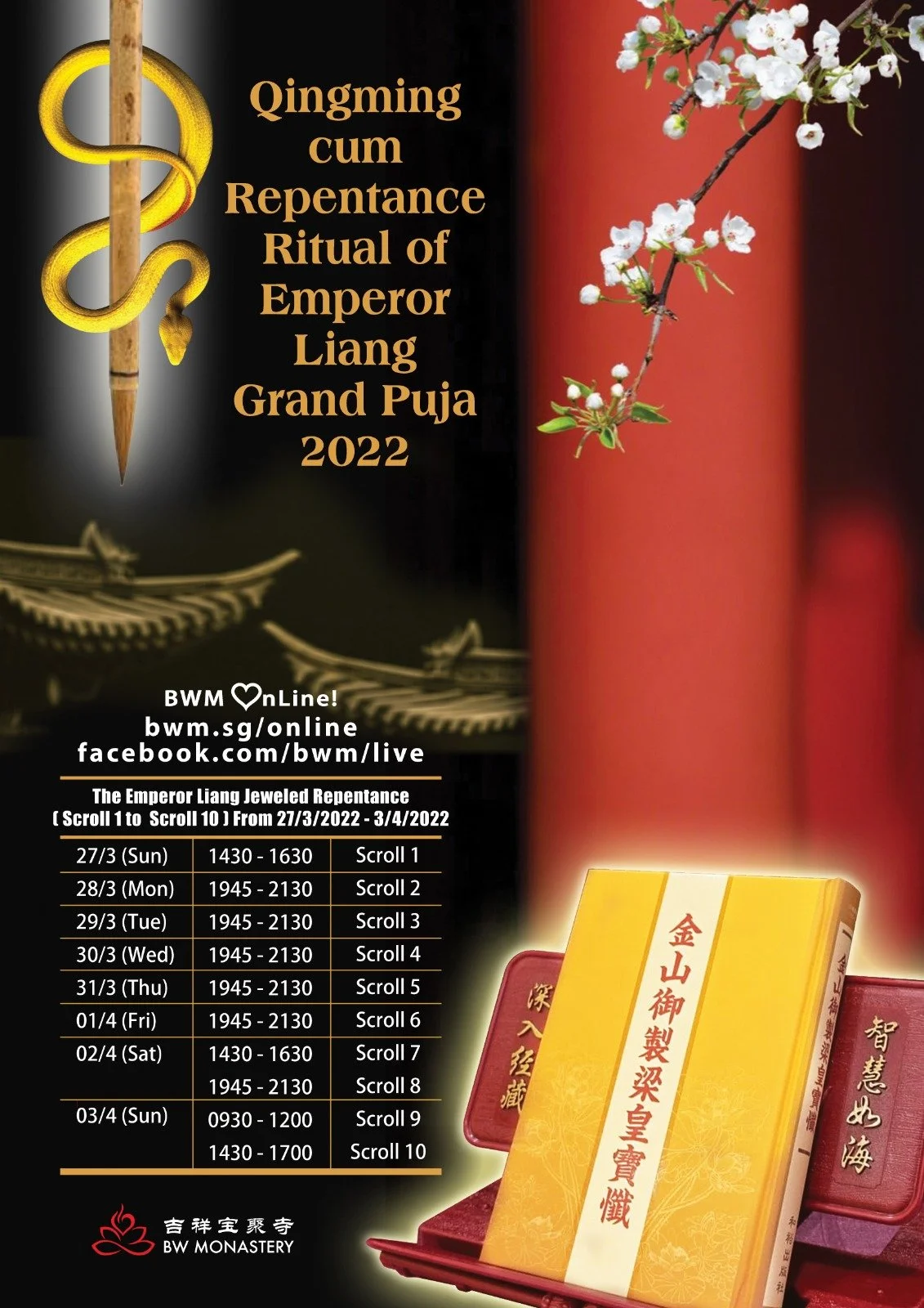 During the Qing Ming festival, we sincerely pay respect to our ancestors and recall their kindness. This allows us to practice and accumulate vast merits. BW Monastery will be holding "The Emperor Liang Jeweled Repentance" Grand Puja for the living and the departed, incorporating sessions to pay respect to the ancestors, supplicate and dedicate merits for the departed to be blessed by the Buddha, eliminate causes to be reborn in miserable realms, and be able to take rebirth in pure land.
