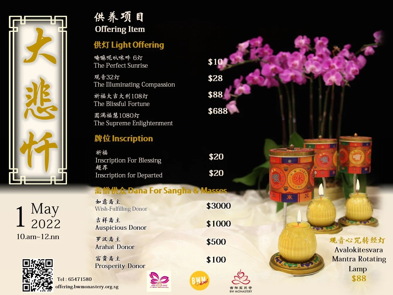拜忏有着不可思议的功德,不仅可以消除众生无始以来的习气、业障、病障外,更可得三宝加持,得清净解脫之心。而为已故六亲眷属、冤亲债主拜忏,也是有着不可思议的功德。 若能在拜忏时以殊胜供品供养诸佛菩萨,其功德更是难以计量。欢迎踊跃订购供品,一起礼拜《大悲忏》。
