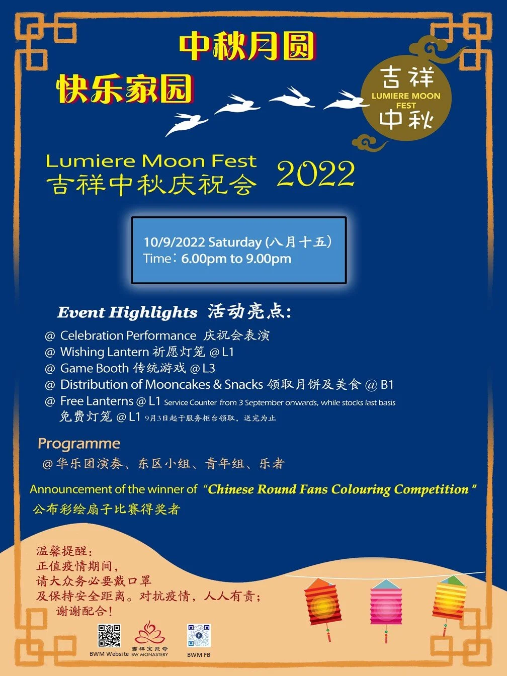 The coming Mid-Autumn Festival celebration on 10 September (Saturday) at BW Monastery is one not to be missed. After a two-year hiatus of on-site activities, our “2022 Lumiere Moon Fest” is now back with a bang! Bring along your family and friends, and return for a joyous reunion. Our celebration performances, wishing lanterns, game booths, as well as delectable mooncakes and snacks await you! click here for more details.