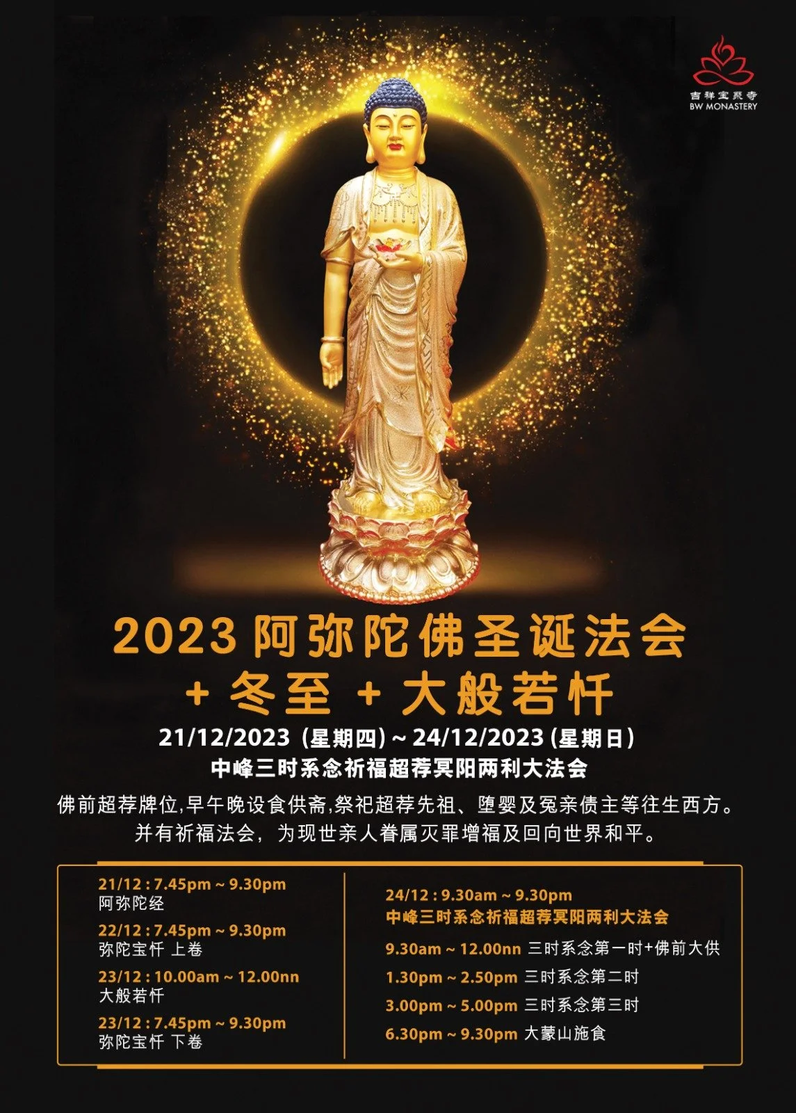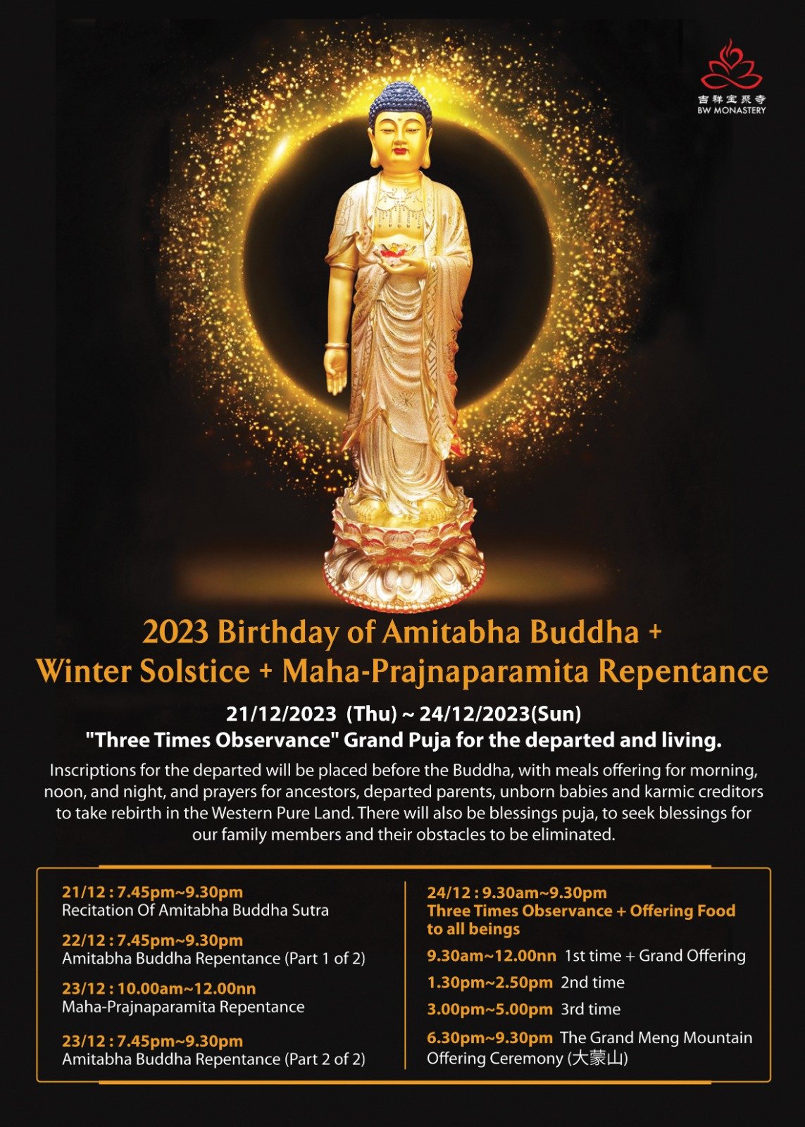 BW Monastery will celebrate Amitabha Buddha's Birthday from 21st till 24th of December 2023. We will be organising the "Three Times Observance" Blessing Puja on the completion day. Inscriptions for the departed will be placed before the Buddha, with meals offering for the 4 days Puja.