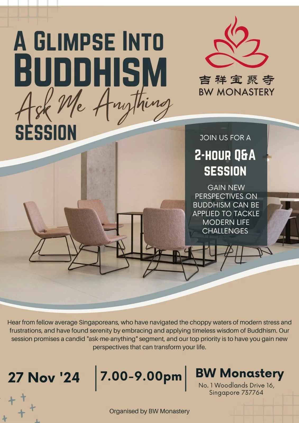 Join us for an enlightening 2-hours session where everyday Singaporeans share how they found peace through Buddhist wisdom amidst the stress of modern life. This candid "ask-me-anything" event is designed to offer fresh perspectives that can transform your life.