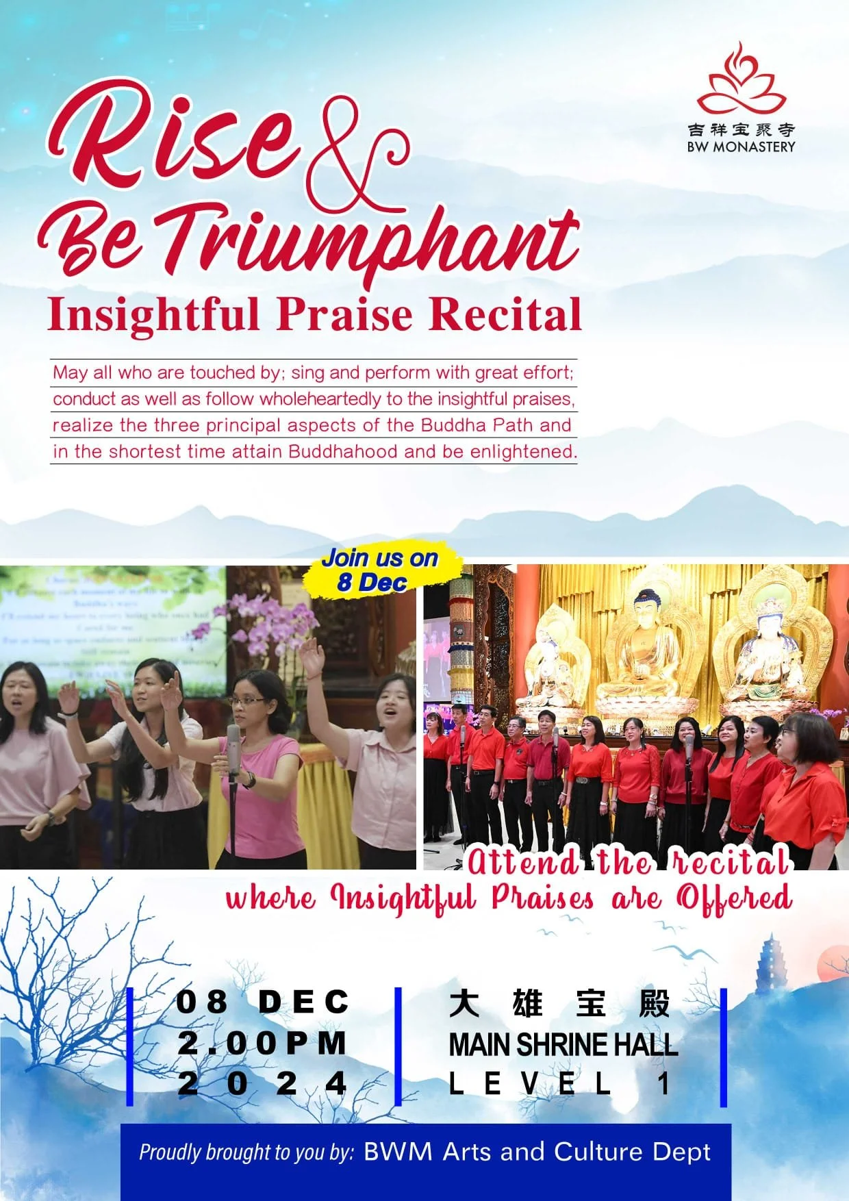 Come and join your virtuous friends in their singing and performance of the praises. When we immerse, harmonise and follow wholeheartedly to the insightful praises, will be guided to realize the three principal aspects of the Buddha Path and in the shortest time attain Buddhahood and be enlightened. So don't miss the golden opportunity.