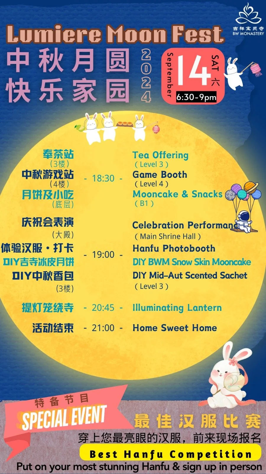 Auspicious Mid Autumn Festival Saturday 14 September 2024 18:30 21:00 BW Monastery No. 1 Woodlands Drive 16, Singapore 737764 Singapore Singapore (map) Google Calendar ICS