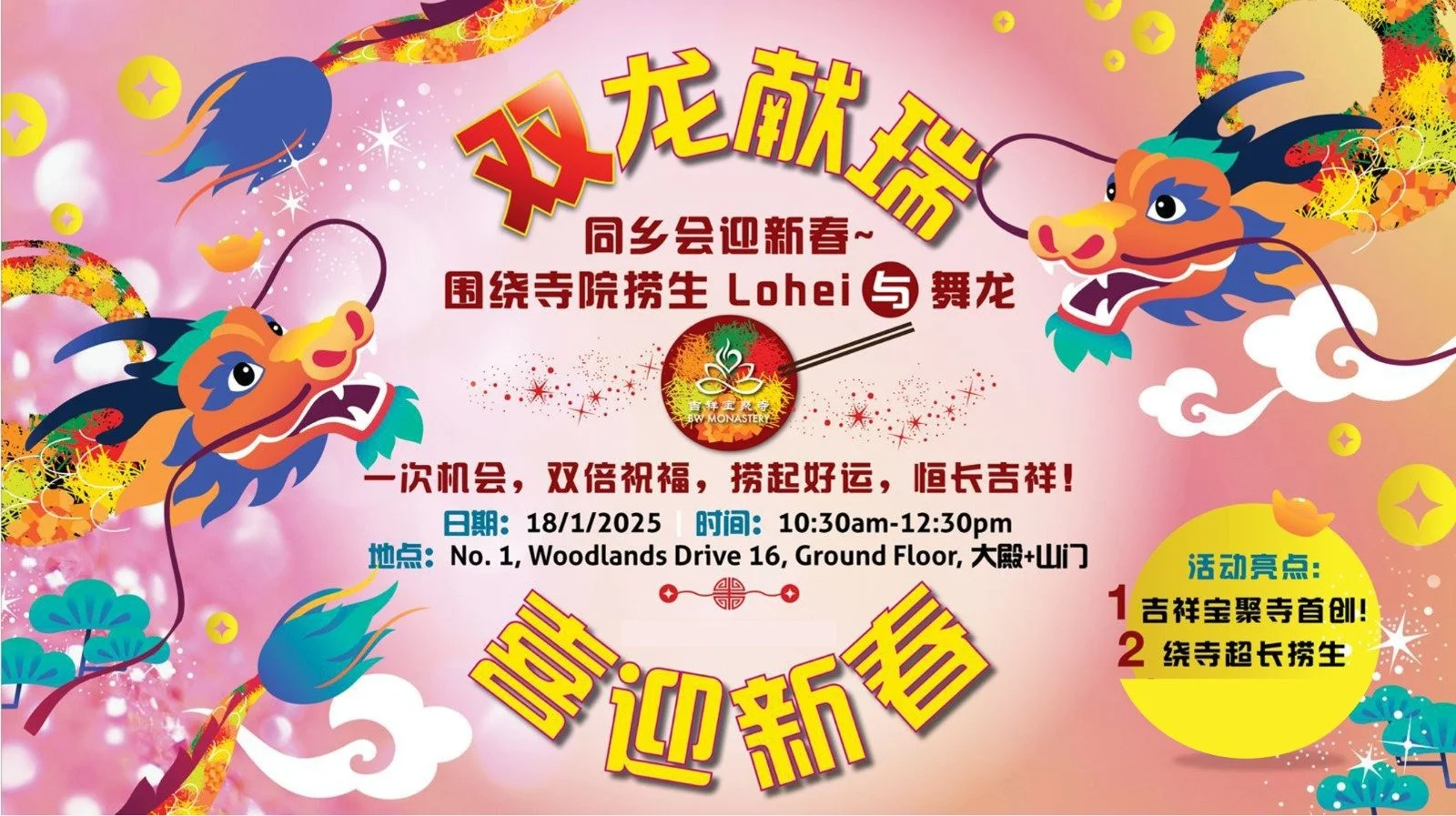 吉祥宝聚寺诚挚邀请大众与信众的家人、朋友共同参加《双龙献瑞,喜迎新春》庆祝活动,一同欢庆新春佳节。本次活动将在吉祥宝聚寺的大雄宝殿与山门举行,为大众呈现一场充满吉祥氛围的盛会。