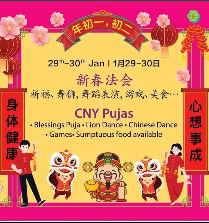 寺院将于初一,初二举办丰富的春节庆祝活动,有舞狮,舞蹈,抄经,解签,挥春及各游戏站,期待与法师,同学、邻里、大众共享佳节欢乐。