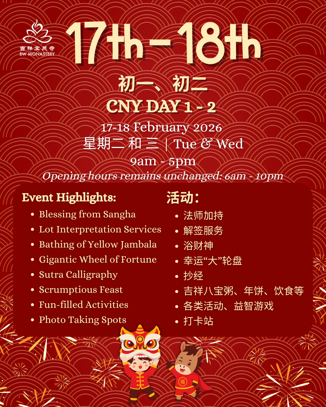 *Note: Opening Hours of BW Monastery will remain as 6am to 10am
