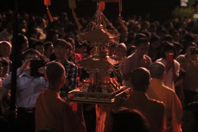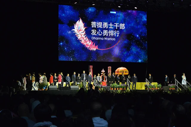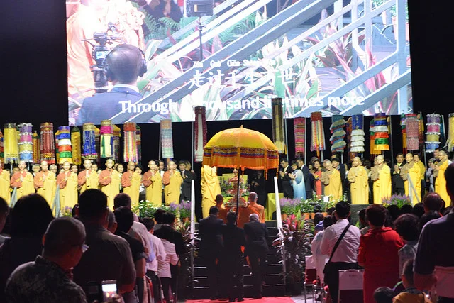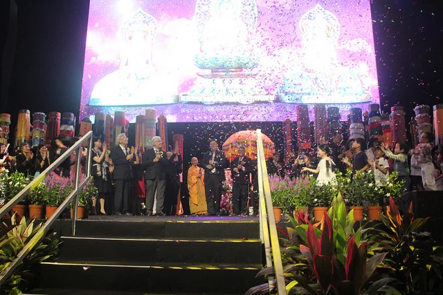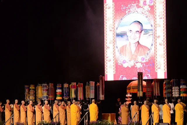 The first highlight of the afternoon’s programme took place when Master’s Relic Stupa was welcomed and received onto stage, escorted by a grand procession led by “heavenly beings” carrying banners, scattering flowers, and followed by Sangha members, the Monastery’s senior lecturers as well as cadres. Late Master’s photo was then clearly projected on stage as the congregation stood tall in veneration to pay homage to Master's Relic while singing the Insightful Praise “When I Meet with You Again”. The Relic represented Master’s presence and it was as if Master had arrived in person and joined the congregation.