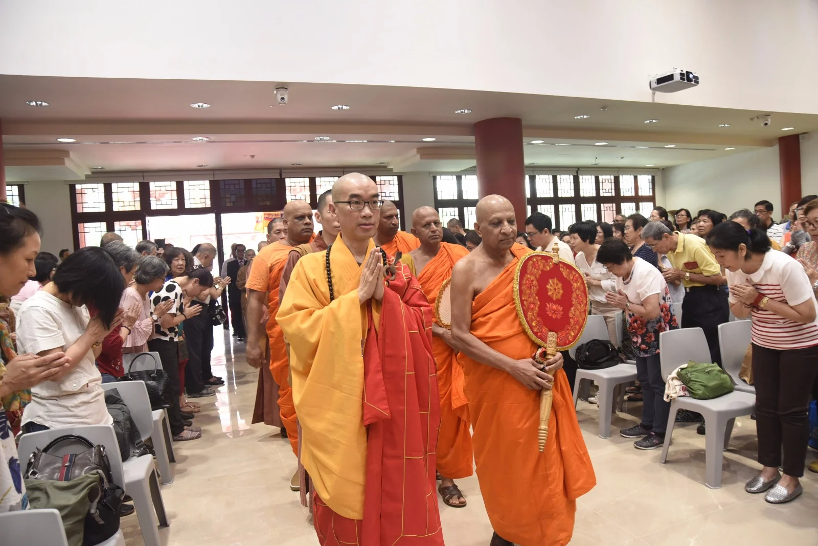 上午十点半,斯里兰卡僧王及四位长老莅临吉祥宝聚寺。僧团、幢幡队及现场七百多位来宾至诚欢喜的迎接僧王与长老的莅临。