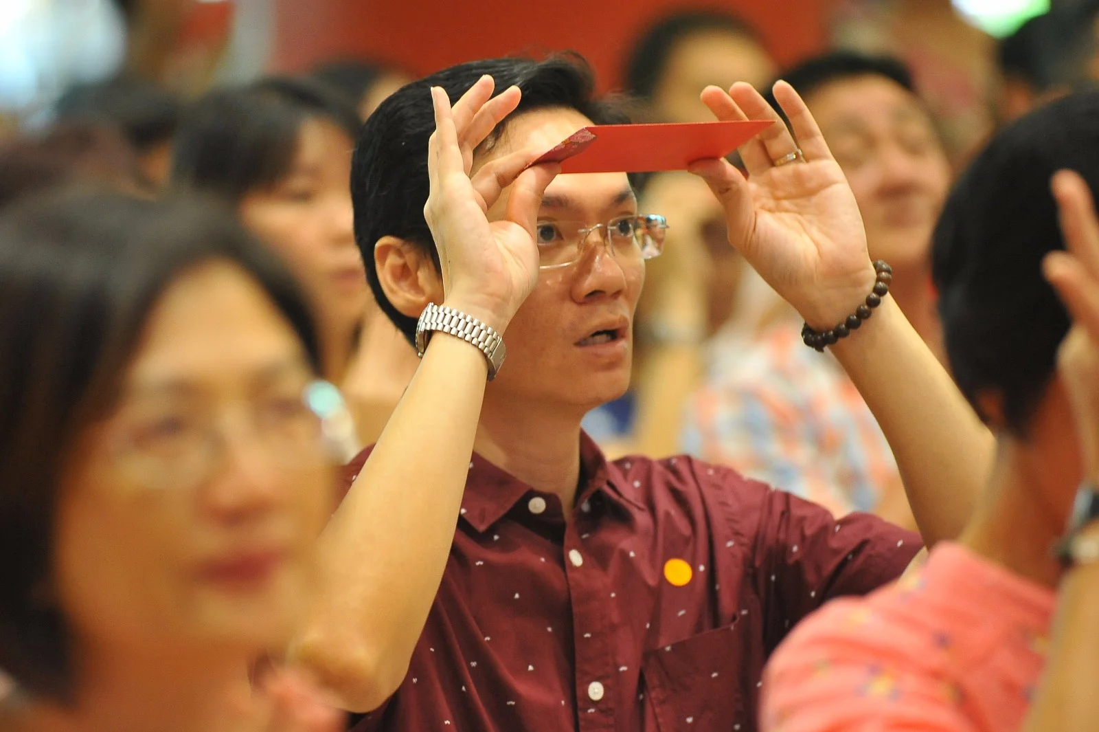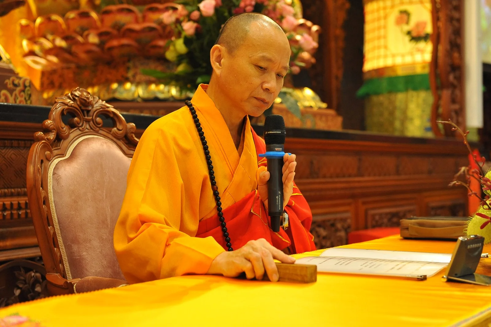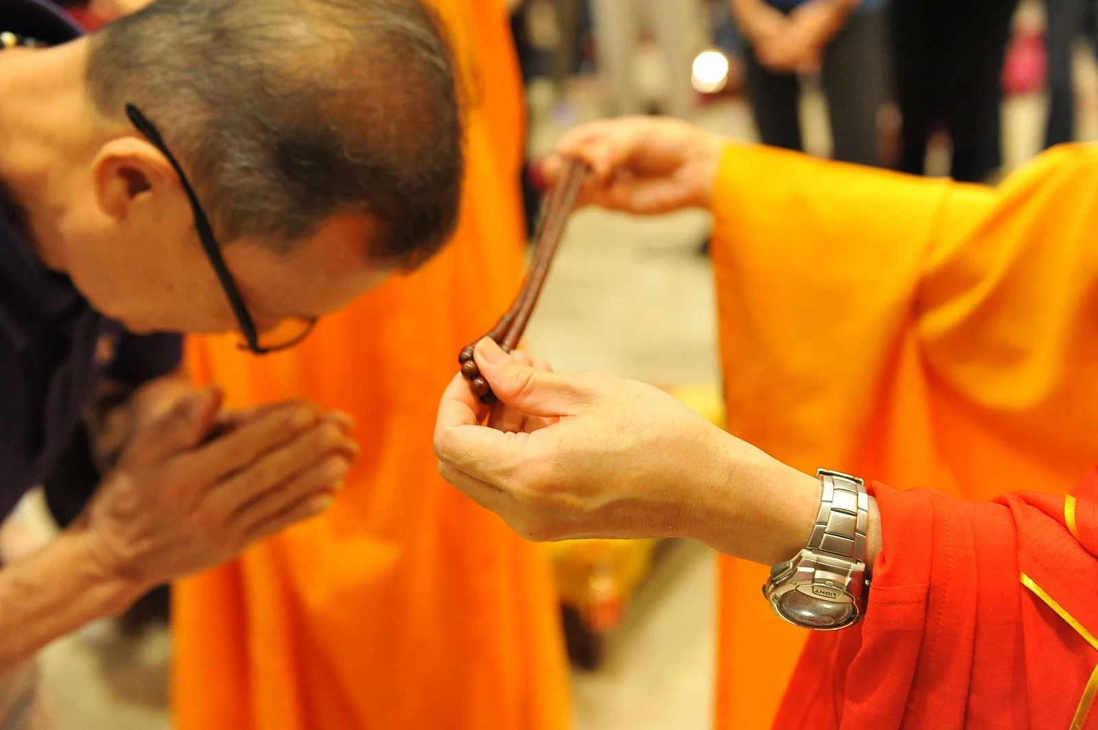 每一位弟子欢喜领纳三宝加持物(一串念珠)。