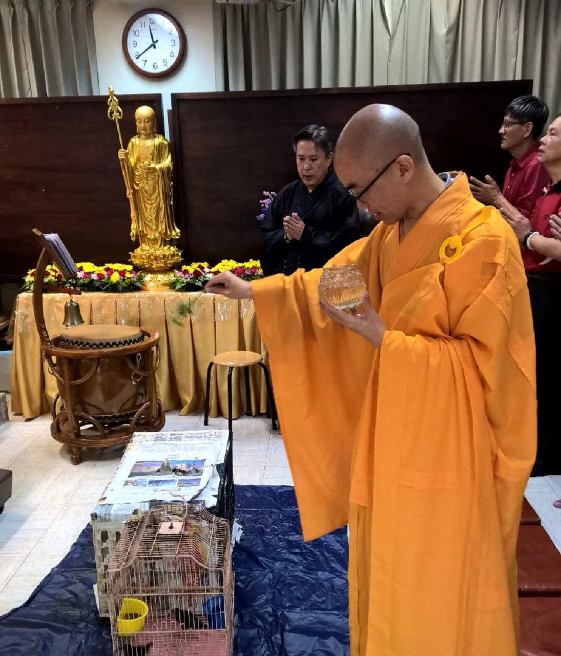 最后,本思法师徐步至放生物之处为127只小鸟洒净、皈依,并回向鸟儿能离三途之苦。法会在约3个小时内圆满结束。
