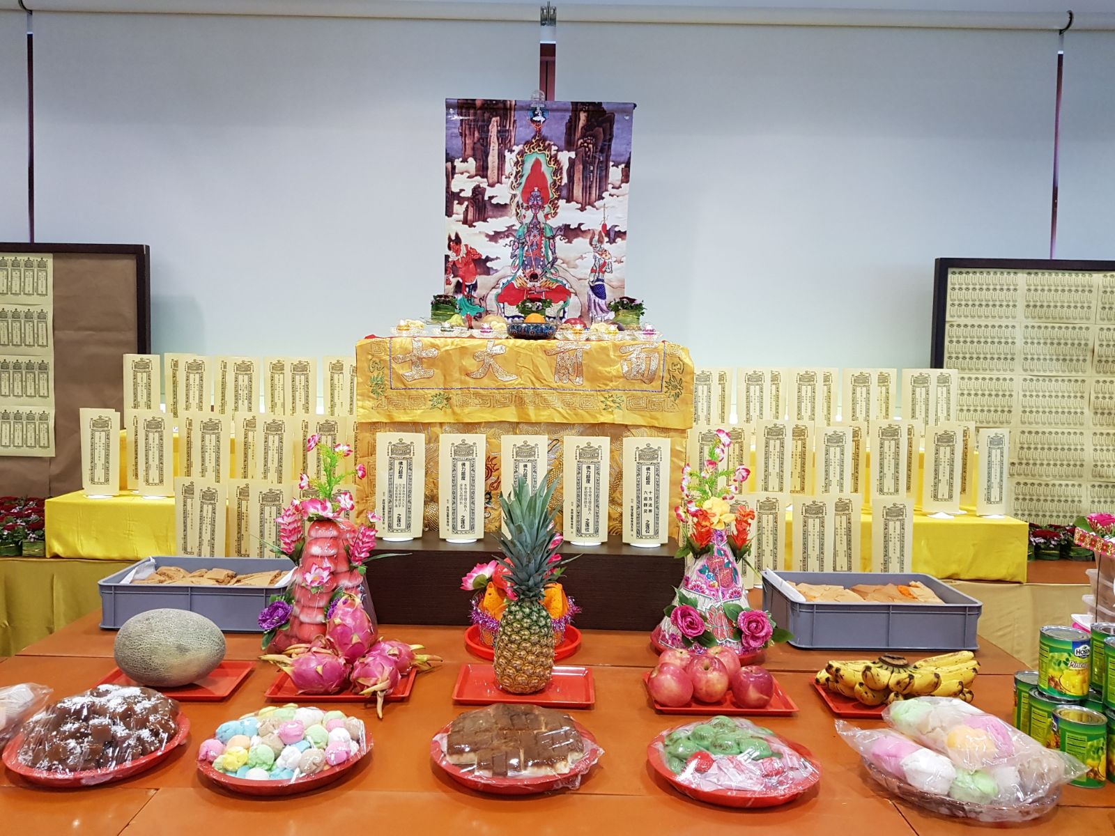 吉祥宝聚寺首次举办盂兰盆地藏王法会 法会 pujas 17 Sept Written By Tan Helen 庄严的坛城两旁,立满了超荐祖先牌位的名单。 淸净梵呗与木鱼声、诵经声交织为虔诚的信仰。 大众虔诚读诵《地藏菩萨本愿经》 本思法师主持佛前大供,众善男女至诚唱诵。 信众享用午餐后在比丘尼法师带领下,接着恭诵地藏经卷下卷。 僧俗二众以各种咒语念助地狱众生可以顺利的受用供养,这就是蒙山施食 本思法师为供品洒净,希愿受用供品的众生都能净化身心,早得脱度。 法会即将圆满,义工们忙着取下超荐单,在诵经中在寺院外慢慢地焚化 中文 Tan Helen