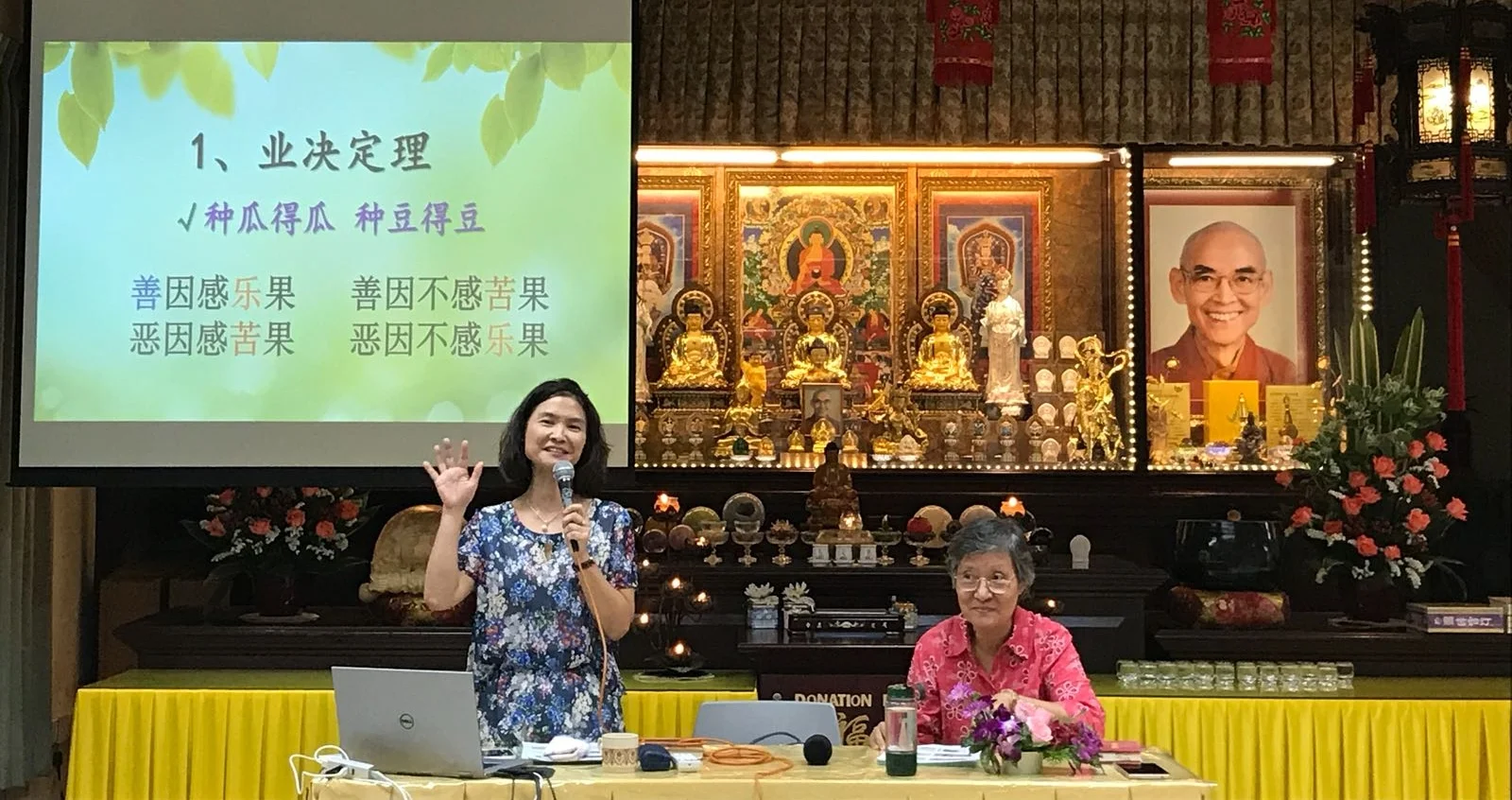 8月1日,位于芽笼区伟城中心三楼大殿,王爱兰及周芸蓉讲师复习业果。