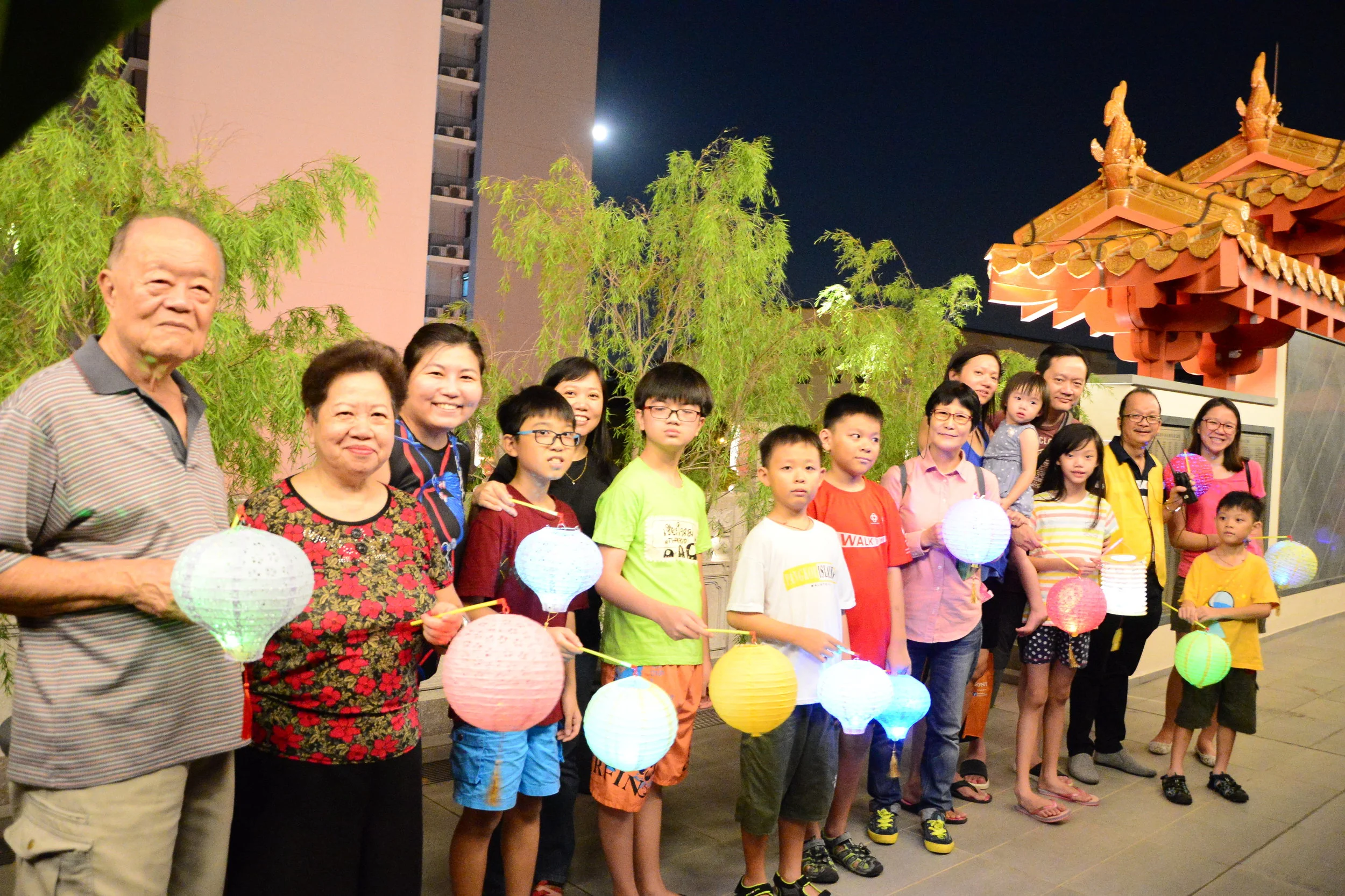 参与游行后的来宾和小朋友,又留下来玩游戏、还飞越时空与嫦娥后羿喜相逢,“咔嚓、咔嚓”拍下全家福留念。老、中、青、幼欢聚一堂乐融融,寺院洋溢着一片欢乐的中秋气氛。