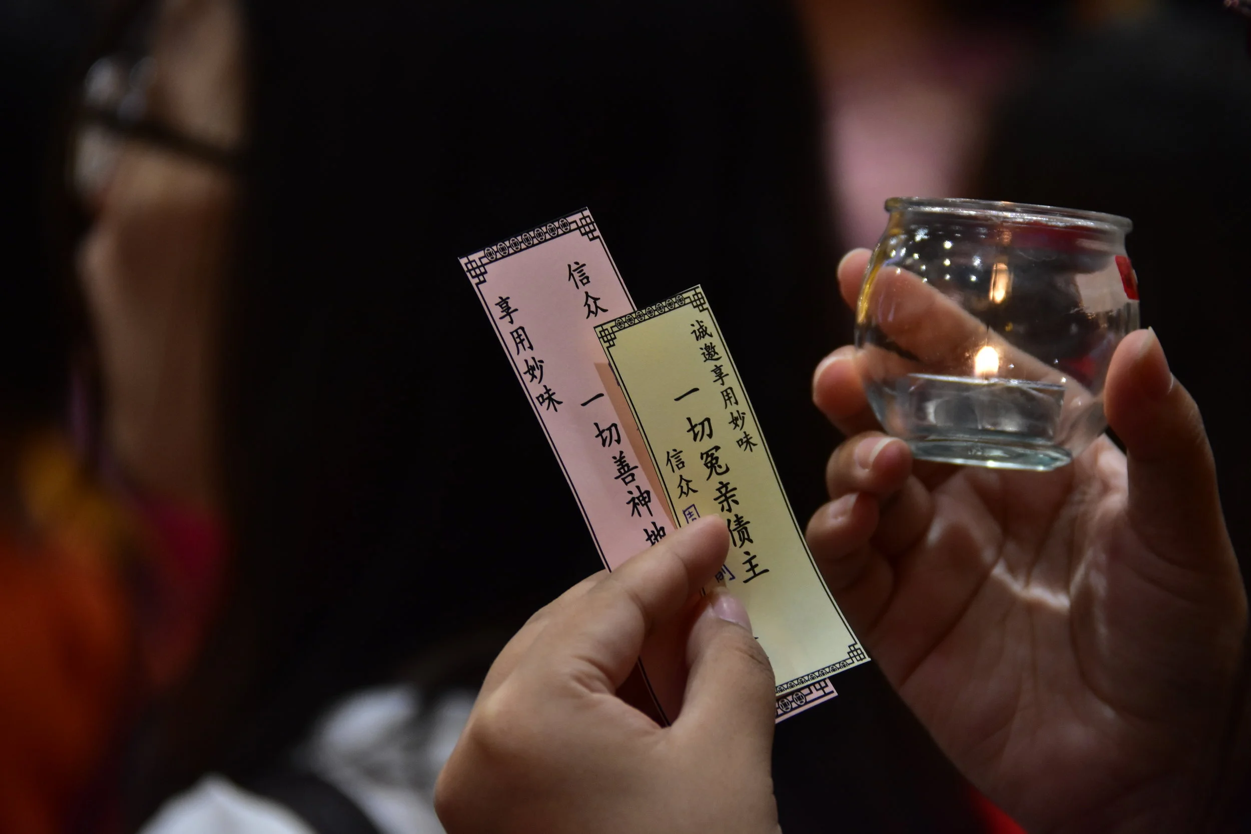 由于信徒众多,法会延至10.30 pm才圆满。最后,义工们在山门分发加持水和橘子,信众脸上都洋溢着幸福满足的笑容。还有一些人则一直逗留在寺院外拍照留念,最后才依依不舍地离开。