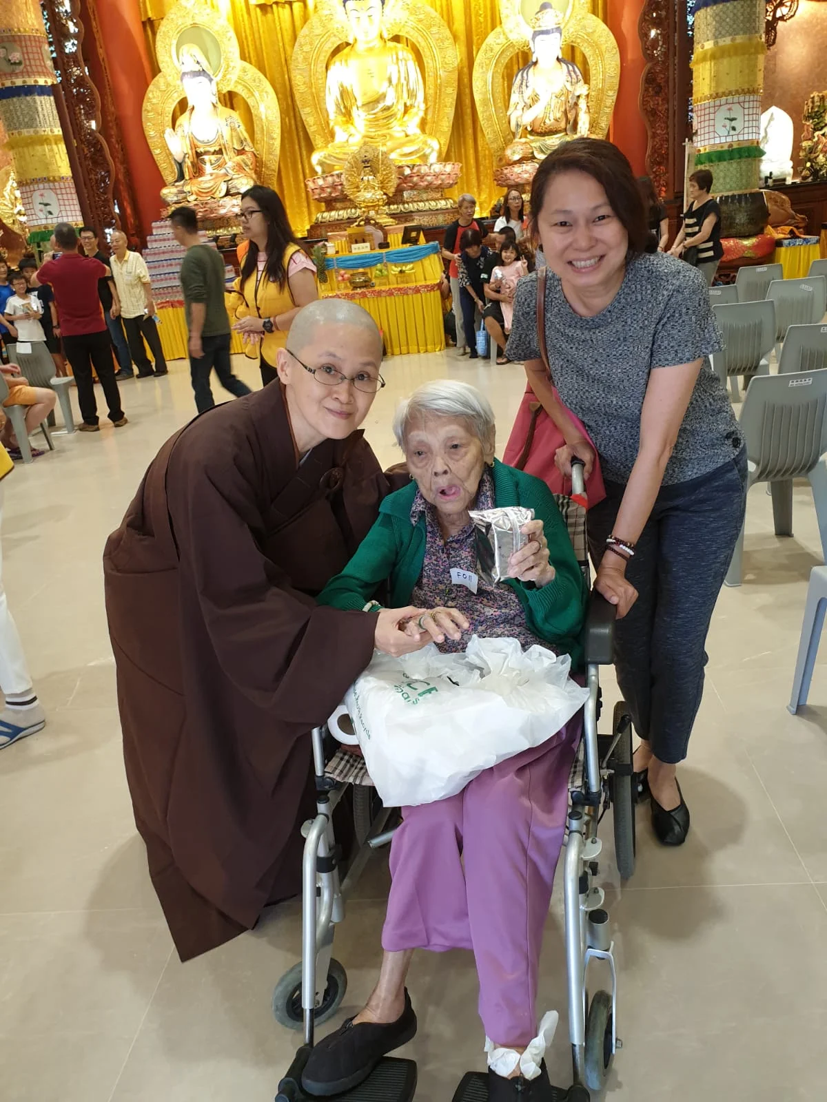 Ms Helen Tan, together with her husband and daughter, brought her 96-year-old mother to participate in the refuge-taking ceremony too. As her mother has been unable to take care of her own daily needs now due to old age, she felt that the ceremony would be the best gift for her mother; where the Triple Gem would bless and guide her, and for higher status life after life to learn the Buddha’s teachings until attaining Buddhahood.