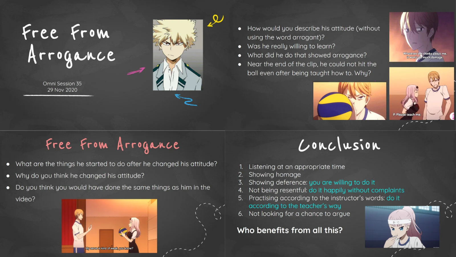 Last Sunday session, the Omni Youths learned the remaining four of the six attributes of being free from arrogance by watching a funny anime volleyball training video. Through short discussions from the video, they were able to have a good understanding of the six attributes and the benefits of listening without being arrogant.