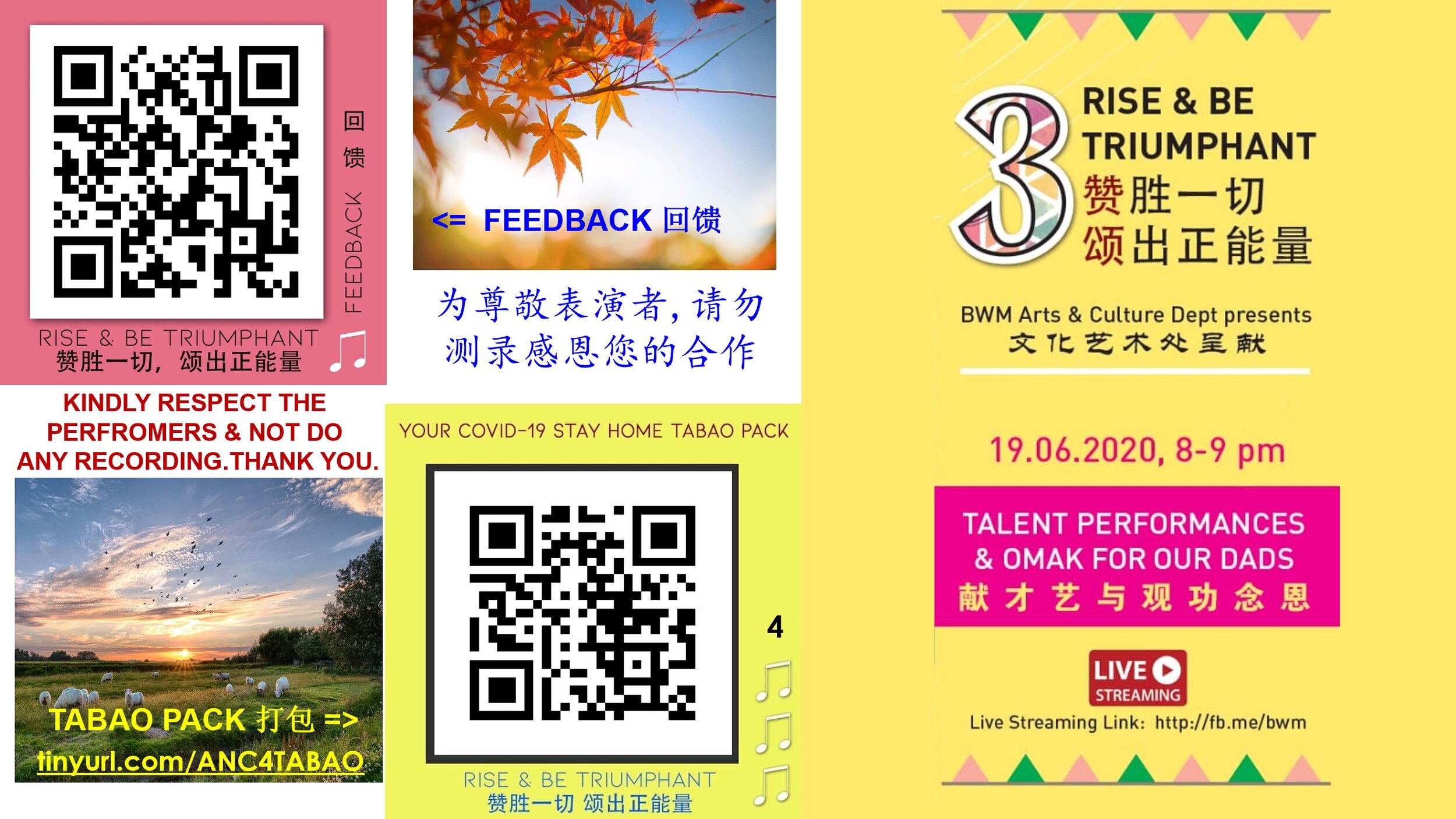 BWM Arts and Culture Department (ANC) presented part 2 of 2020 RISE AND BE TRIUMPHANT 3 : A TRIBUTE TO FATHERS on 19/6/2020, 8pm-9pm, online, with talent performances by the members and family. It was infused with love and gratitude to pay tribute to their fathers!