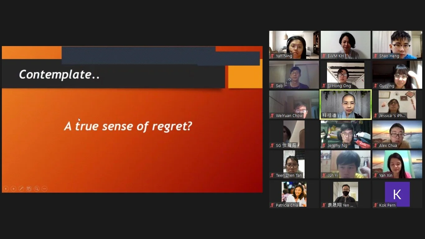 The youth class 16Z051Y was honoured to have Venerable Zu Dao as their guest for class on Monday. Under the Venerable's guidance and with great respect, the youths took refuge by chanting the 35 Buddhas Repentance in English.