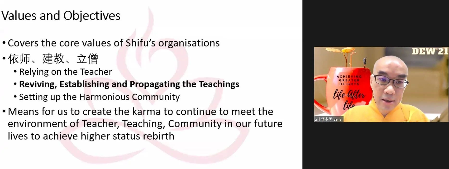 Venerable Bensi started by bringing up the key theme of the current DEW, which is Achieving Greater Heights Life after Life. Venerable elaborated that we need high status rebirth in every life as an important condition to get better and achieve full liberation to become Buddha. Master Jih-Chang and Teacher have created a conducive environment for us to create good karma. This DEW covered the core values taught by Master, which concerned our current and future lives.