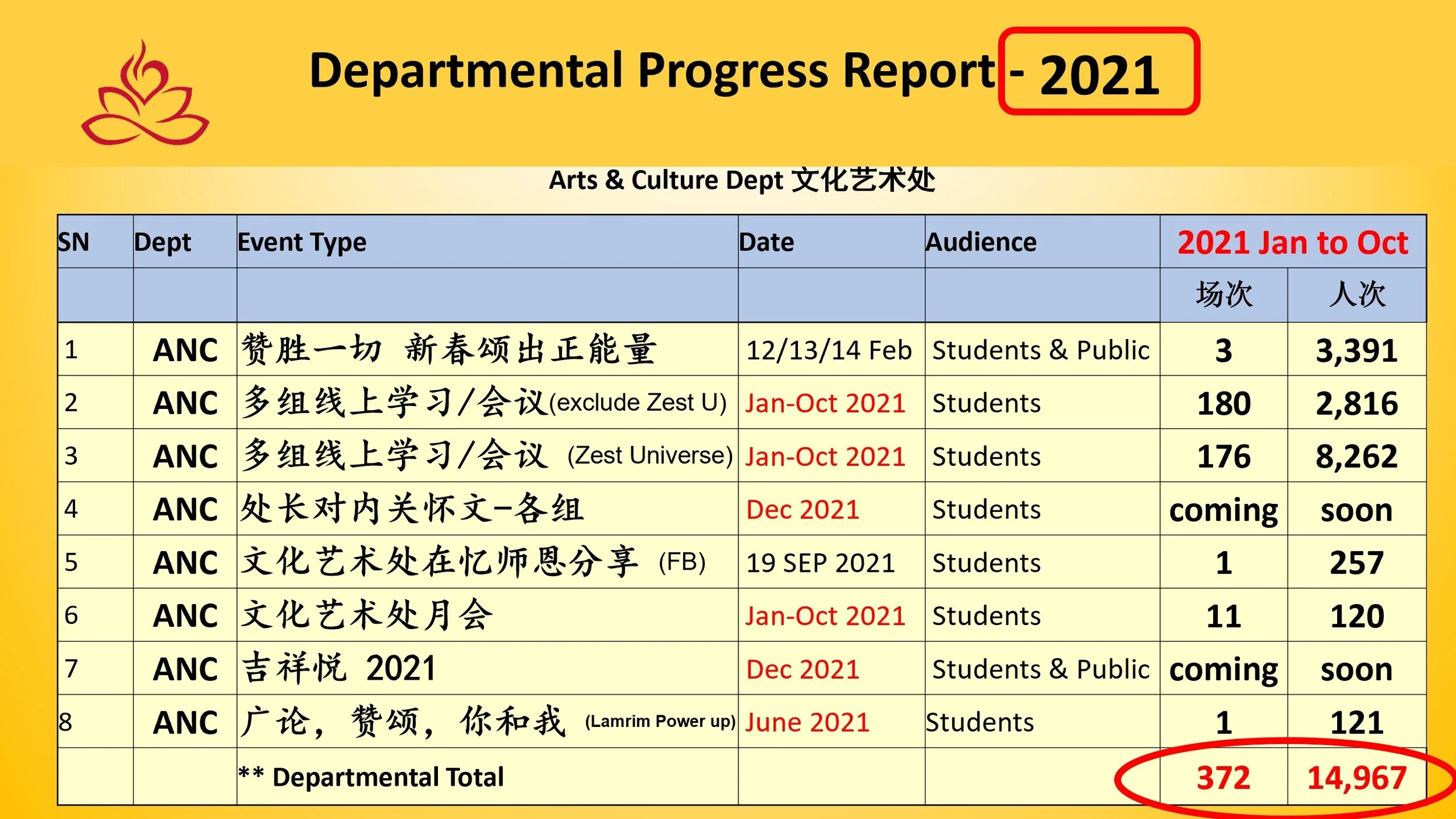 Rejoice to the cadres and group leaders, not forgetting the diligent members of Arts and Culture Department and our fellow supporters cum friends! We thank BW Monastery for its resourcefulness in enticing members to participate joyously in all the online activities and courses. There were 14,967 people who took part in all online learnings, meetings, and activities.