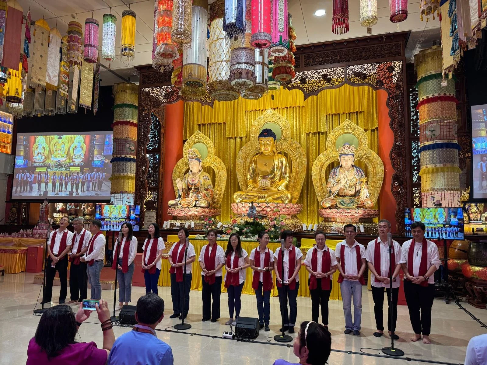 赞颂一班自成立以来参加过寺院举办的无数次的音声供养。几乎每场活动都可以看到赞颂一班的同学们一起来做音声供养。这次的活动带来了三首赞颂,首先由女生呈现《觅幽兰》和《相思湖畔》。男女混合声唱《灭死胜甘露》。