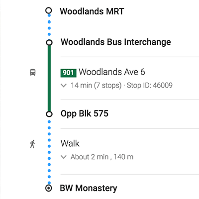 Take Bus 901M from the bus stop outside Admiralty MRT. Alight after 4 stops at Blk 573A (you will actually pass by BW Monastery on the bus) and walk about 130m before arriving at the monastery.