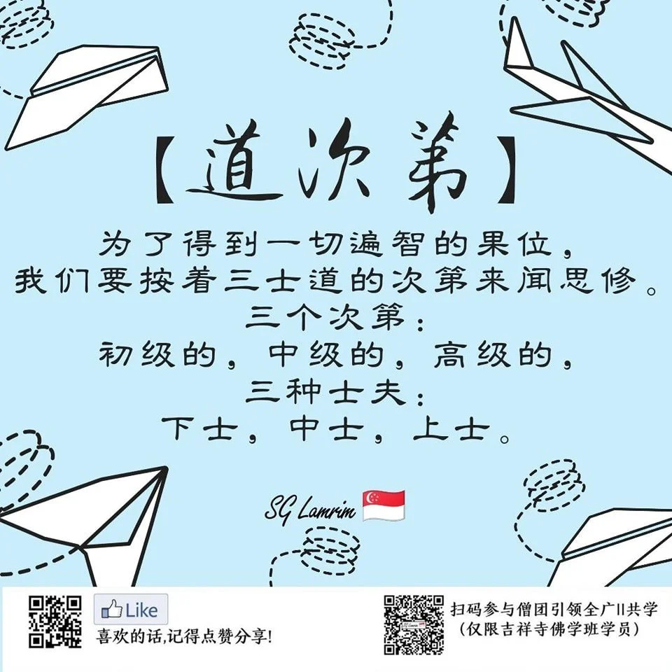 道次第 SG Lamrim Reflections 15 Dec Written By Linda Neo 为了得到一切遍智的果位,我们要按着三士道的次第来闻思修。三个次第:初级的,中级的,高级的。三种士夫:下士,中士,上士。 中文 Linda Neo
