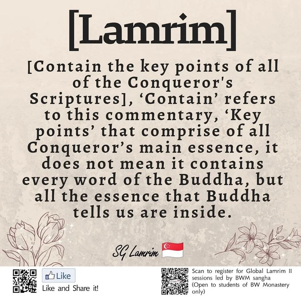[Contain the key points of all of the Conqueror's Scriptures], ‘Contain’ refers to this commentary, ‘Key points’ that comprise of all Conqueror’s main essence, it does not mean it contains every word of the Buddha, but all the essence that Buddha tells us are inside.