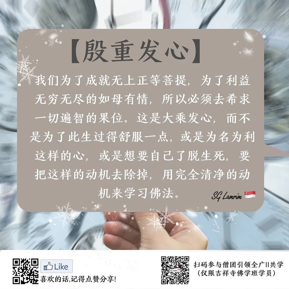 殷重发心 SG Lamrim Reflections 5 Dec Written By Linda Neo 我们为了成就无上正等菩提,为了利益无穷无尽的如母有情,所以必须去希求一切遍智的果位。这是大乘发心,而不是为了此生过得舒服一点, 或是为名为利这样的心,或是想要自己了脱生死,要把这样的动机去除掉,用完全清净的动机来学习佛法。 中文 Linda Neo