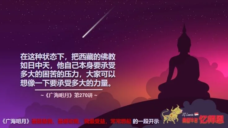 “但是大家也都知道阿底峡尊者舍寿二十载,到底是怎么舍的?可以想像:他本来是一个王子,经历这样的一个海拔;还有印度是很热的,而到了阿里那边其实是很冷的;再加上饮食习惯;再加上很多人都不是跟他说一个语言的,都说藏文,原来熟悉的朋友和上师们都不在,就他来到这边,他可能只能跟他的几个翻译对话。所以到了一个这样的地方。在这种状态下,把西藏的佛教如日中天,他自己本身要承受多大的困苦的压力,大家可以想像一下要承受多大的力量。”~《广海明月》第270讲