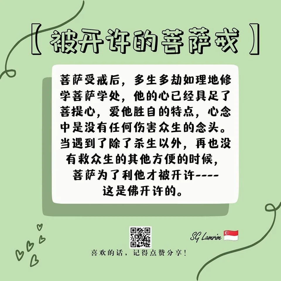 被开许的菩萨戒 SG Lamrim Reflections 10 Oct Written By Linda Neo 菩萨受戒后,多生多劫如理地修学菩萨学处,他的心已经具足了菩提心,爱他胜自的特点,心念中是没有任何伤害众生的念头。当遇到了除了杀生以外,再也没有救众生的其他方便的时候,菩萨为了利他才被开许----这是佛开许的。 中文 Linda Neo