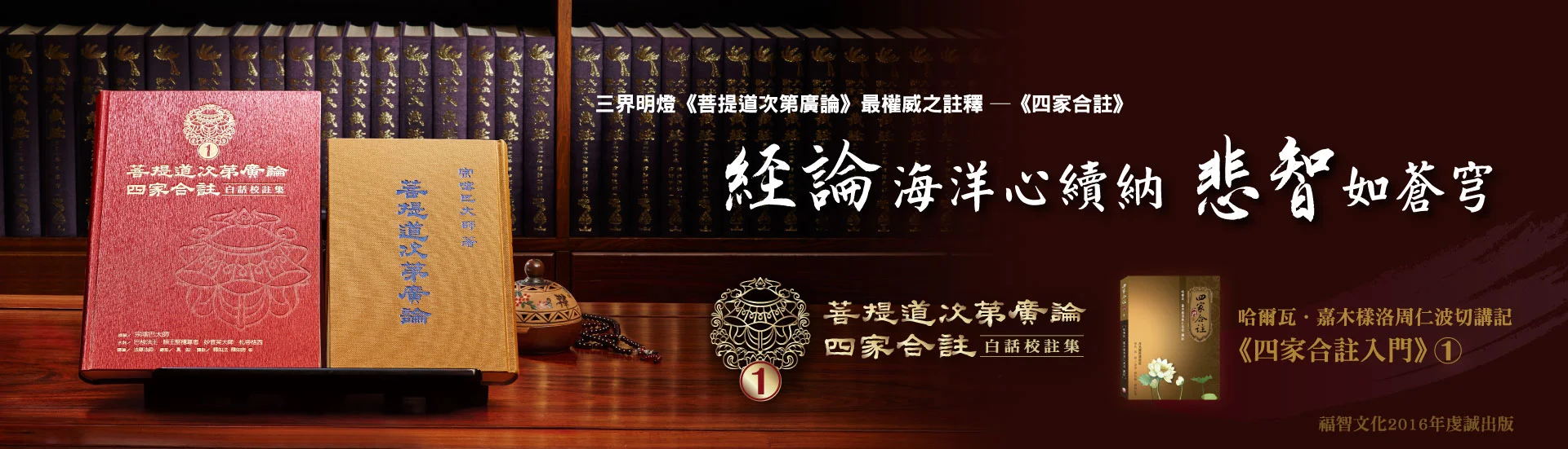 就这样,继续学《广论》,有一次就请问仁波切说:“《广论》有没有注释?藏地的大德有没有写注释?”仁波切说:“道次第的注释在藏地可多了!好几百种。”我惊讶说:“居然有这么多!那有没有一本翻译过来呢?”我说:“在各大流通处好像都找不到。”仁波切说: “看起来是没有人翻译过。”我就请问说:“法尊法师当时翻译了《广论》,为什么没有翻译一些注释呢?后来也没有译师翻译。”仁波切说:“啊!原因很多吧!”我说:“我好想好想有一本《广论》的注释啊!”于是我就请问仁波切说:“最著名的是哪几本注释?”仁波切说:“《四家合注》很著名。”听到四家注,心中一震,忽觉千载难逢,不由自主跪下来跟仁波切说:“请您传给我《四家合注》的讲诵传承吧!”然后我说:“我自己学《广论》实在是很需要。听常师父带子已经对我有极大的帮助,但是我真的好想学毗钵舍那,想要彻底知道生死要怎样了脱,求您一定要传给我传承啊!”仁波切说:“过去班禅大师在1987年创建了中国藏语系高级佛学院,我是第一届的学僧,当时主要学习的课本就是《四家合注》。我在夏日东仁波切座前,经历九个月的时间,听完了《四家合注》的讲诵。如果讲《四家合注》,我想一方面是传授传承,一方面也可以用讨论的方式一起学习吧!”从那时候开始,我就期盼着、渴望着,一有机会就跟仁波切启白。仿佛穷子翘首渴望,那远行的父亲驾船归来,承载着无量珍宝的传承之舟,再度停泊于我心灵的渡口。
